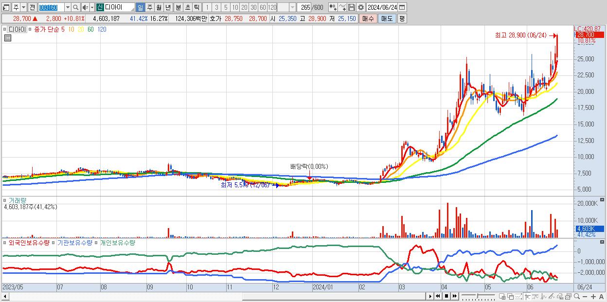 - 디아이 (28,700원 ▲ 10.81% , 시총: 8,122억, 거래량: 4,603,187, 거래대금:1,243억)