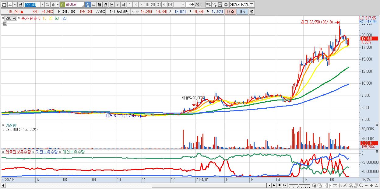 - 와이씨 (19,280원 ▲ 4.5% , 시총: 15,818억, 거래량: 6,391,188, 거래대금:1,216억)