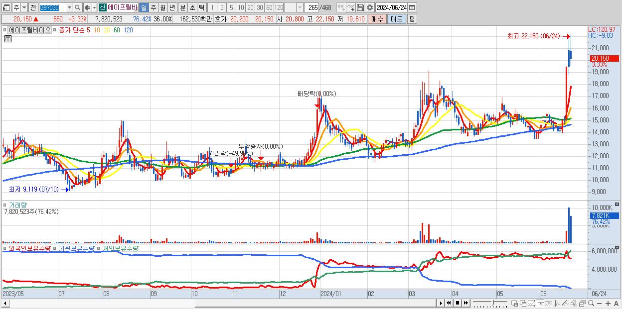 - 에이프릴바이오 (20,150원 ▲ 3.33% , 시총: 4,377억, 거래량: 7,820,523, 거래대금:1,625억)