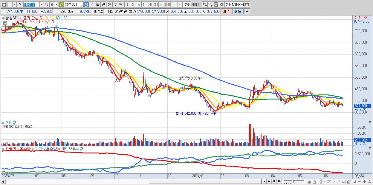 - 삼성SDI (377,500원 ▼ -2.96% , 시총: 259,586억, 거래량: 296,362, 거래대금:1,126억)
