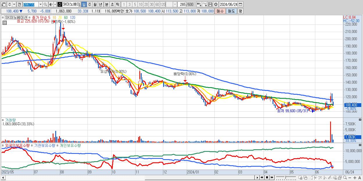 - SK이노베이션 (108,400원 ▼ -5% , 시총: 103,777억, 거래량: 1,063,080, 거래대금:1,169억)