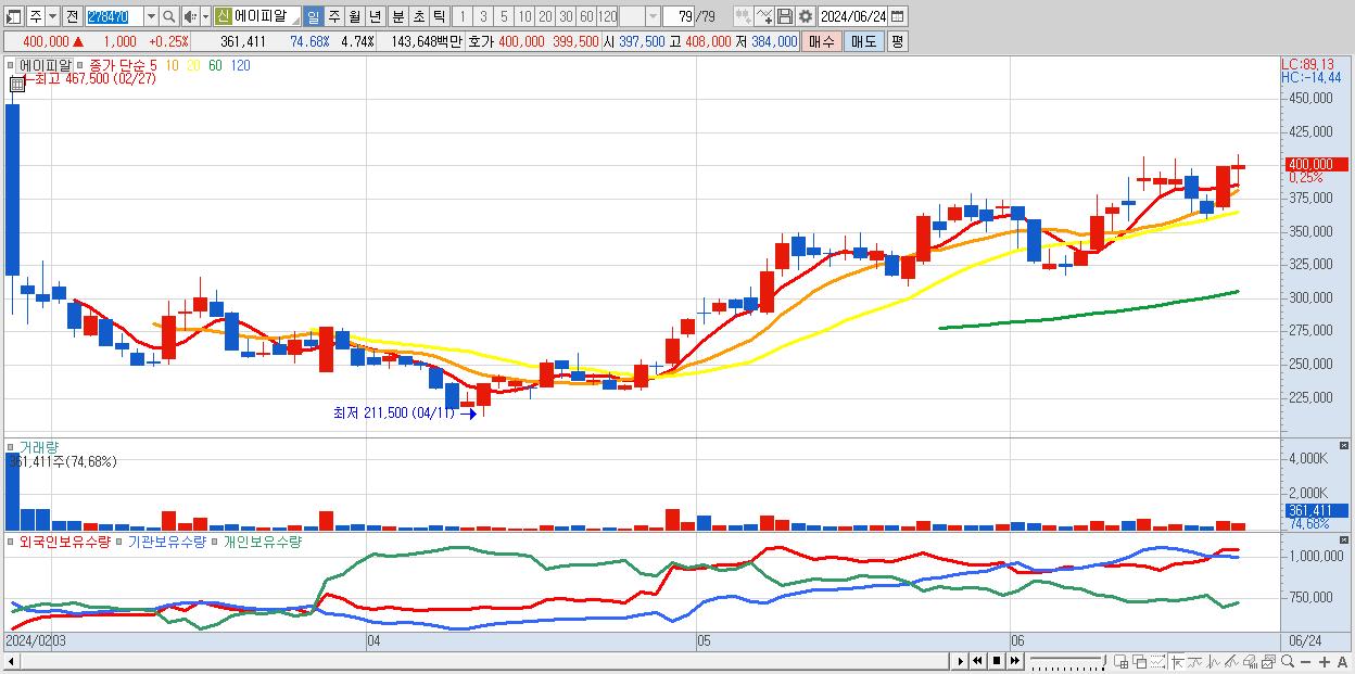 - 에이피알 (400,000원 ▲ 0.25% , 시총: 30,481억, 거래량: 361,411, 거래대금:1,436억)