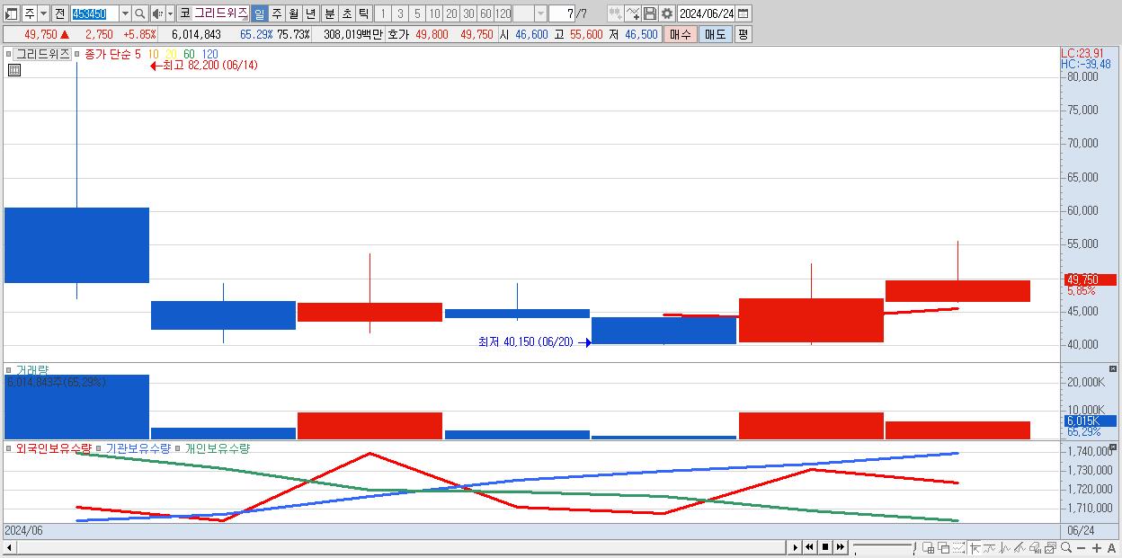 - 그리드위즈 (49,750원 ▲ 5.85% , 시총: 3,952억, 거래량: 6,014,843, 거래대금:3,080억)