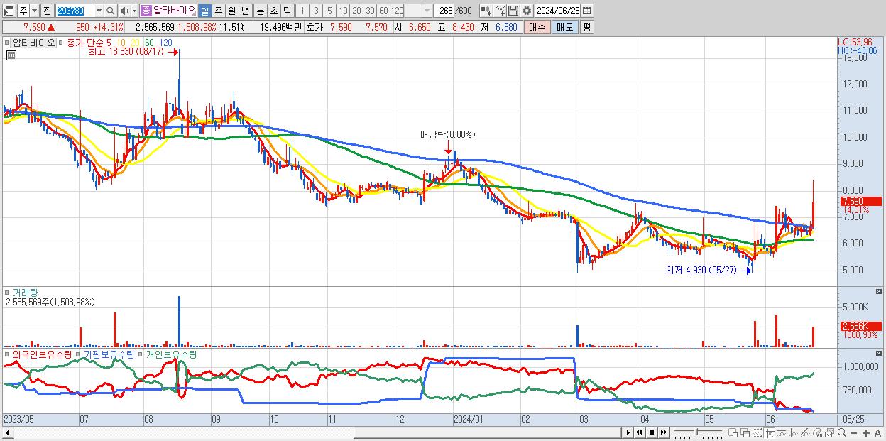 - 압타바이오 (7,590원 ▲ 14.31% , 시총: 1,692억, 거래량: 2,565,569, 거래대금:195억)