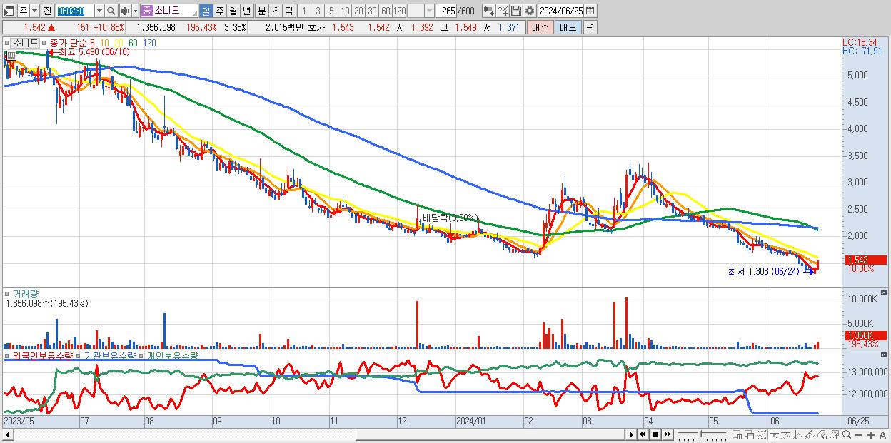- 소니드 (1,542원 ▲ 10.86% , 시총: 622억, 거래량: 1,356,098, 거래대금:20억)