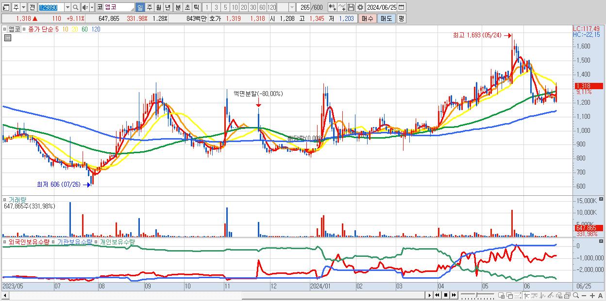 - 앱코 (1,318원 ▲ 9.11% , 시총: 667억, 거래량: 647,865, 거래대금:8억)