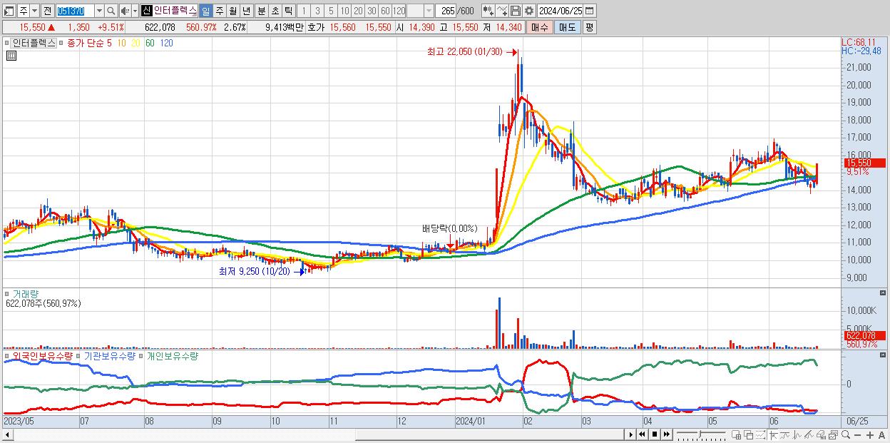 - 인터플렉스 (15,550원 ▲ 9.51% , 시총: 3,627억, 거래량: 622,078, 거래대금:94억)