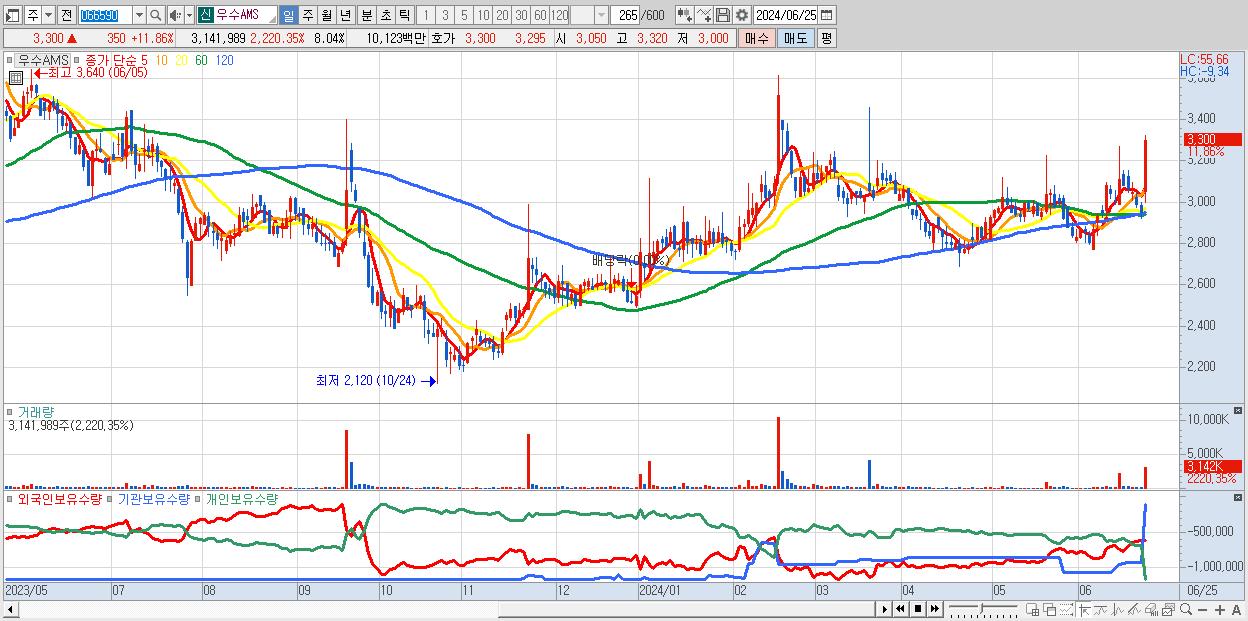 - 우수AMS (3,300원 ▲ 11.86% , 시총: 1,289억, 거래량: 3,141,989, 거래대금:101억)