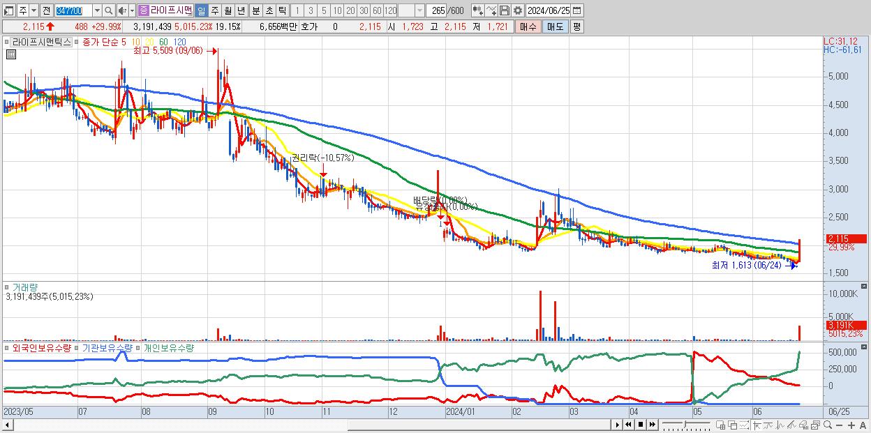 - 라이프시맨틱스 (2,115원 ▲ 29.99% , 시총: 352억, 거래량: 3,191,439, 거래대금:67억)