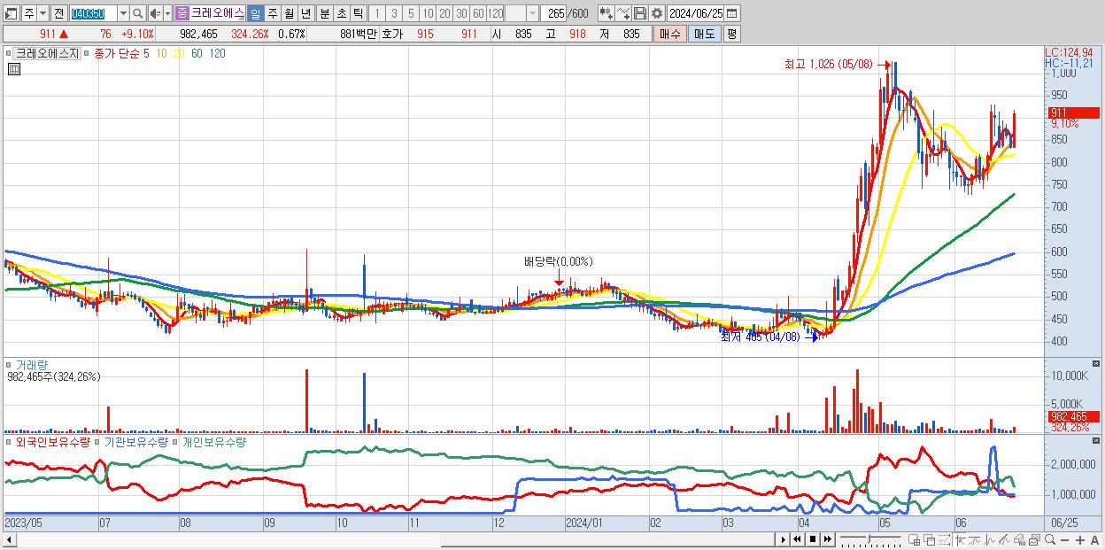 - 크레오에스지 (911원 ▲ 9.1% , 시총: 1,336억, 거래량: 982,465, 거래대금:9억)