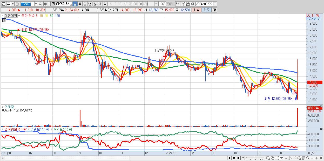 - 이연제약 (14,000원 ▲ 10.32% , 시총: 2,602억, 거래량: 836,744, 거래대금:126억)