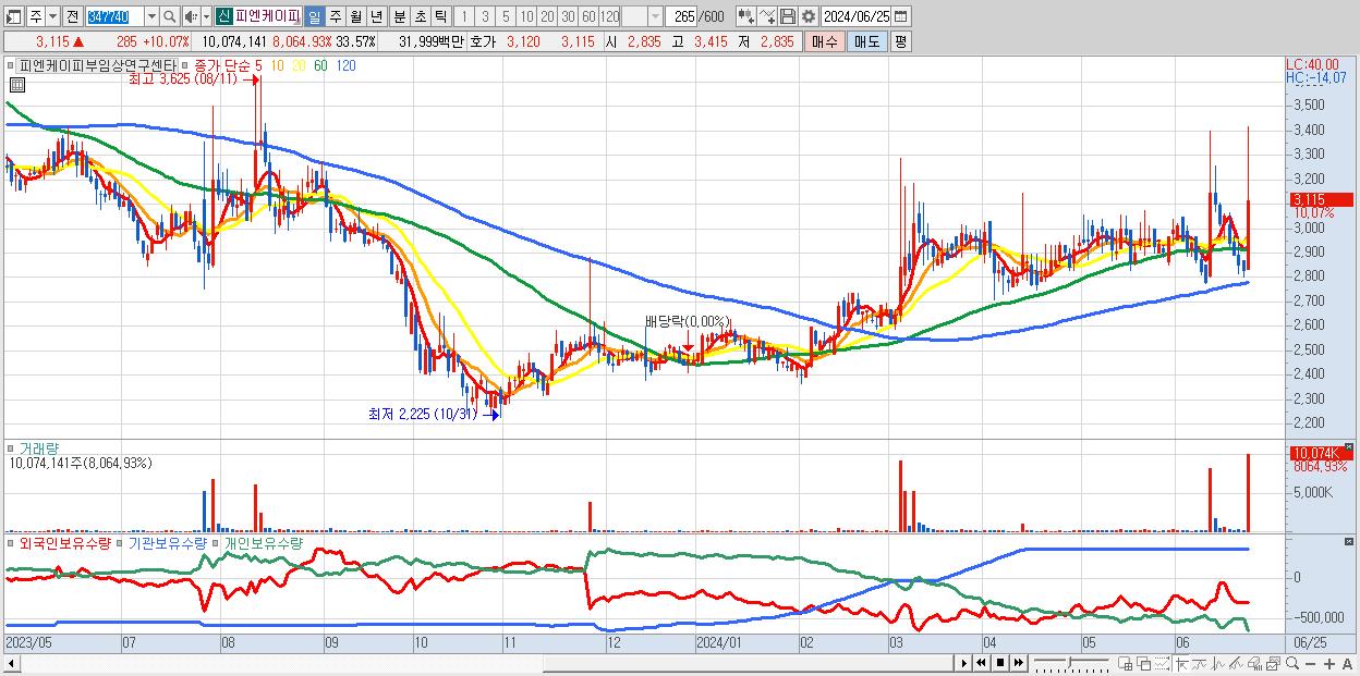 - 피엔케이피부임상연구센타 (3,115원 ▲ 10.07% , 시총: 935억, 거래량: 10,074,141, 거래대금:320억)
