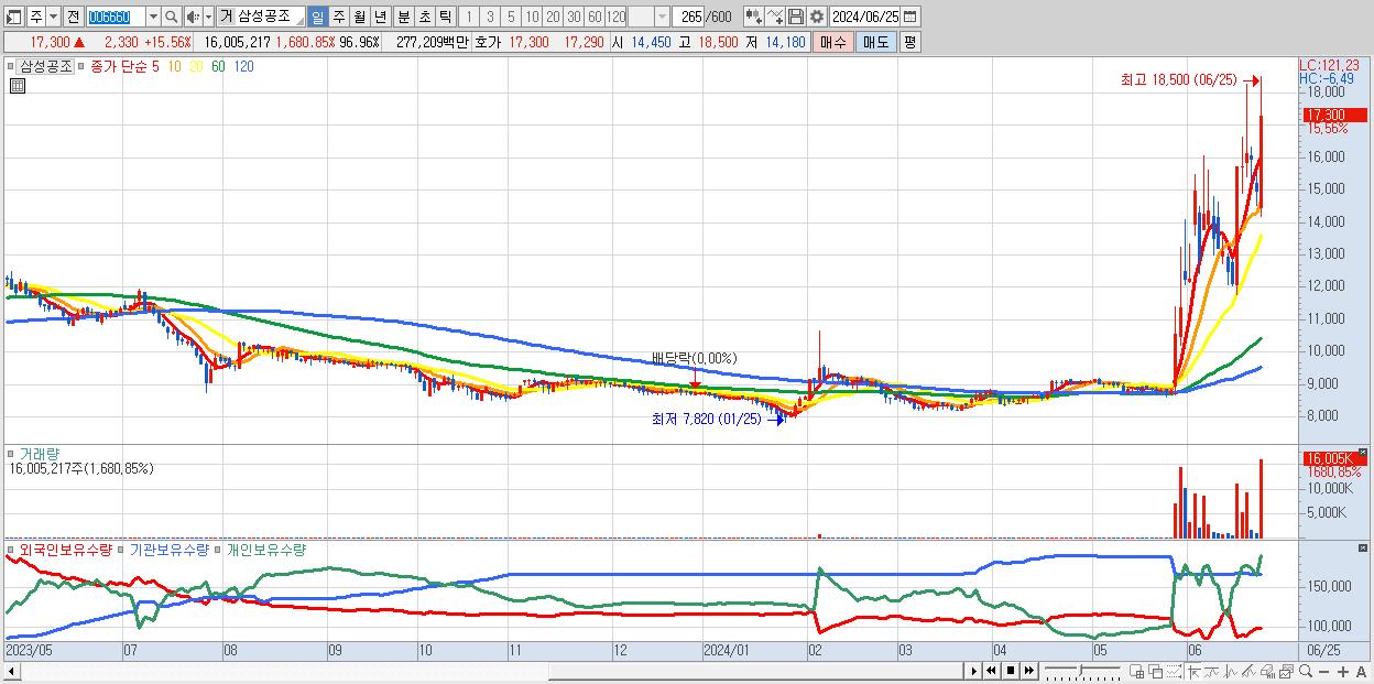 - 삼성공조 (17,300원 ▲ 15.56% , 시총: 1,406억, 거래량: 16,005,217, 거래대금:2,772억)