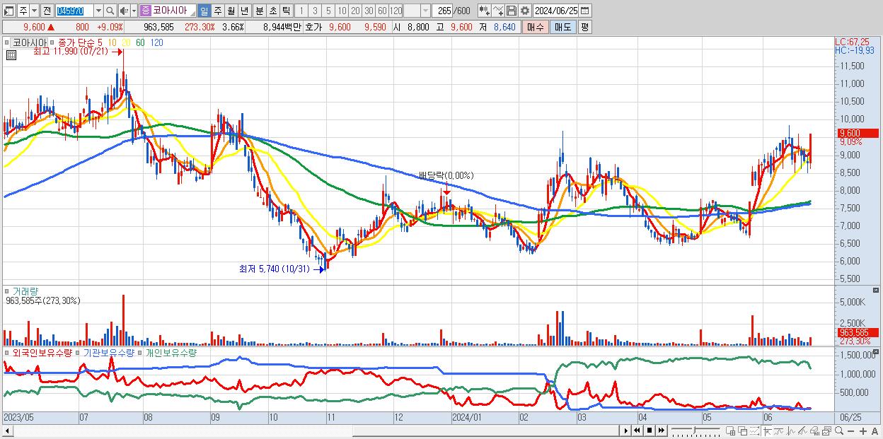 - 코아시아 (9,600원 ▲ 9.09% , 시총: 2,526억, 거래량: 963,585, 거래대금:89억)