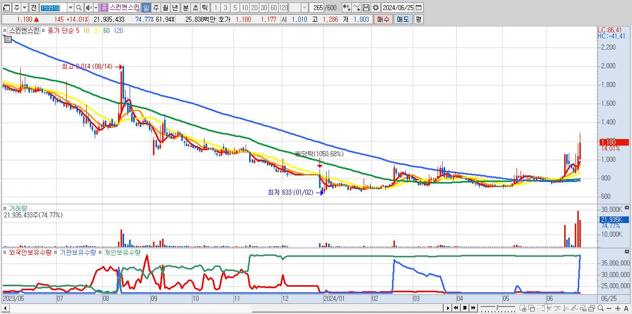 - 스킨앤스킨 (1,180원 ▲ 14.01% , 시총: 418억, 거래량: 21,935,433, 거래대금:258억)