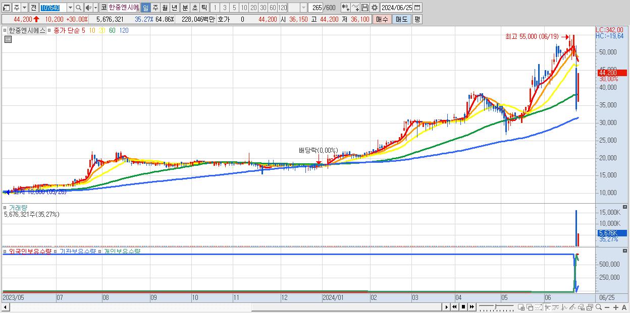 1.한중엔시에스 44,200원 ▲ 30% (KOSDAQ, 107640)
