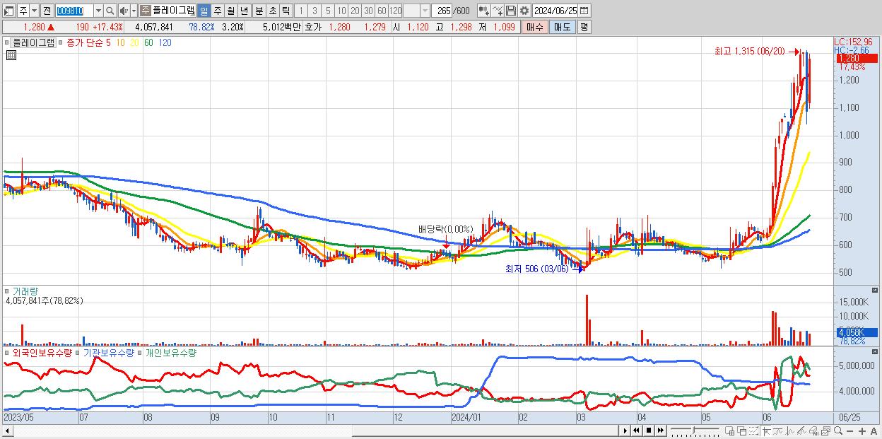 - 플레이그램 (1,280원 ▲ 17.43% , 시총: 1,622억, 거래량: 4,057,841, 거래대금:50억)