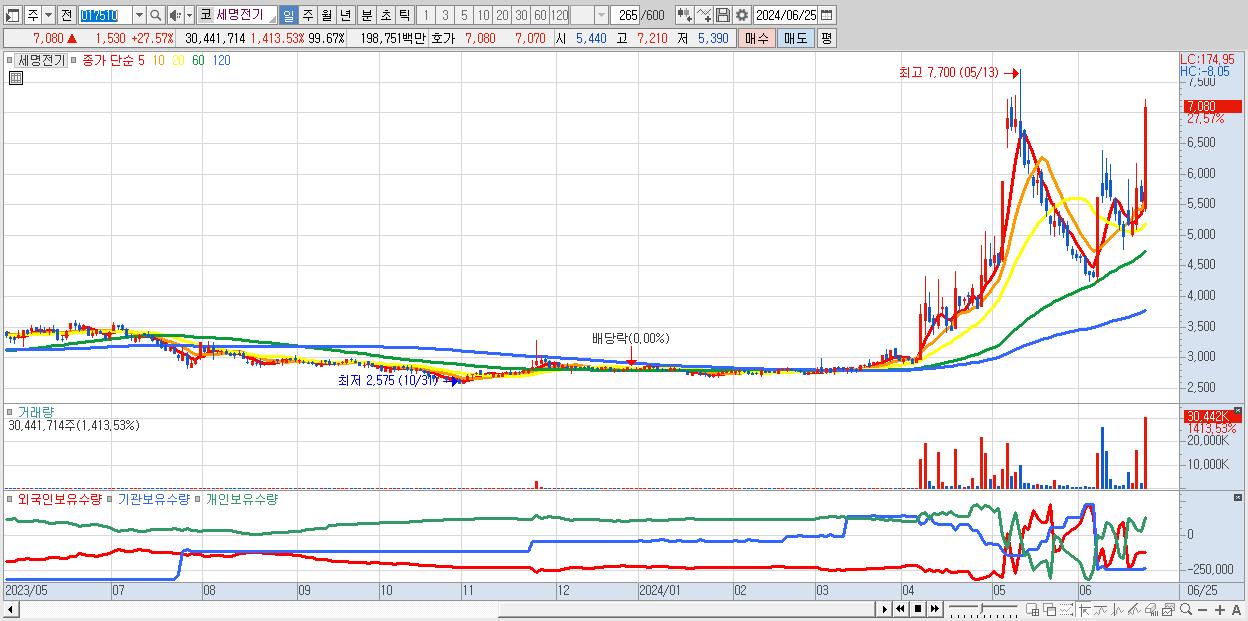 - 세명전기 (7,080원 ▲ 27.57% , 시총: 1,079억, 거래량: 30,441,714, 거래대금:1,988억)