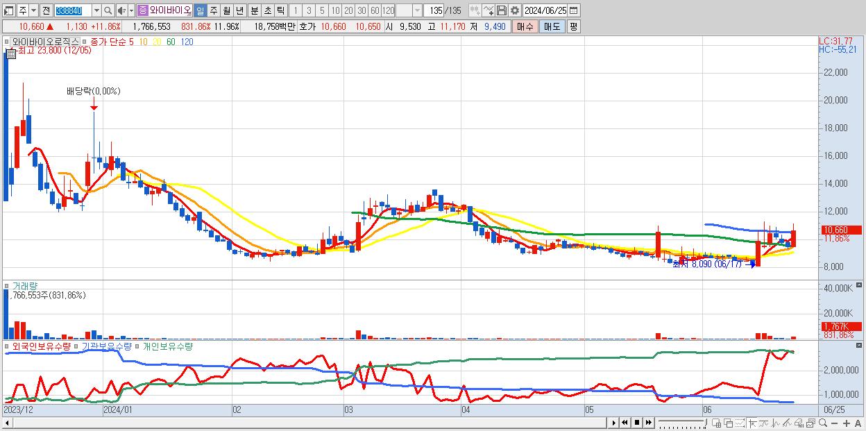 - 와이바이오로직스 (10,660원 ▲ 11.86% , 시총: 1,574억, 거래량: 1,766,553, 거래대금:188억)