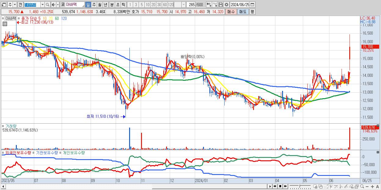 - 아바텍 (15,700원 ▲ 10.25% , 시총: 2,450억, 거래량: 539,674, 거래대금:83억)