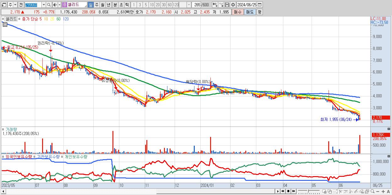 - 셀리드 (2,170원 ▲ 8.77% , 시총: 295억, 거래량: 1,176,430, 거래대금:26억)