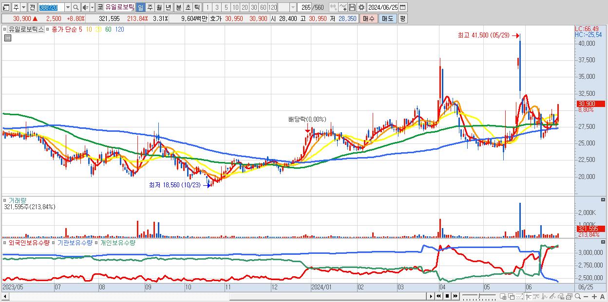 - 유일로보틱스 (30,900원 ▲ 8.8% , 시총: 3,003억, 거래량: 321,595, 거래대금:96억)