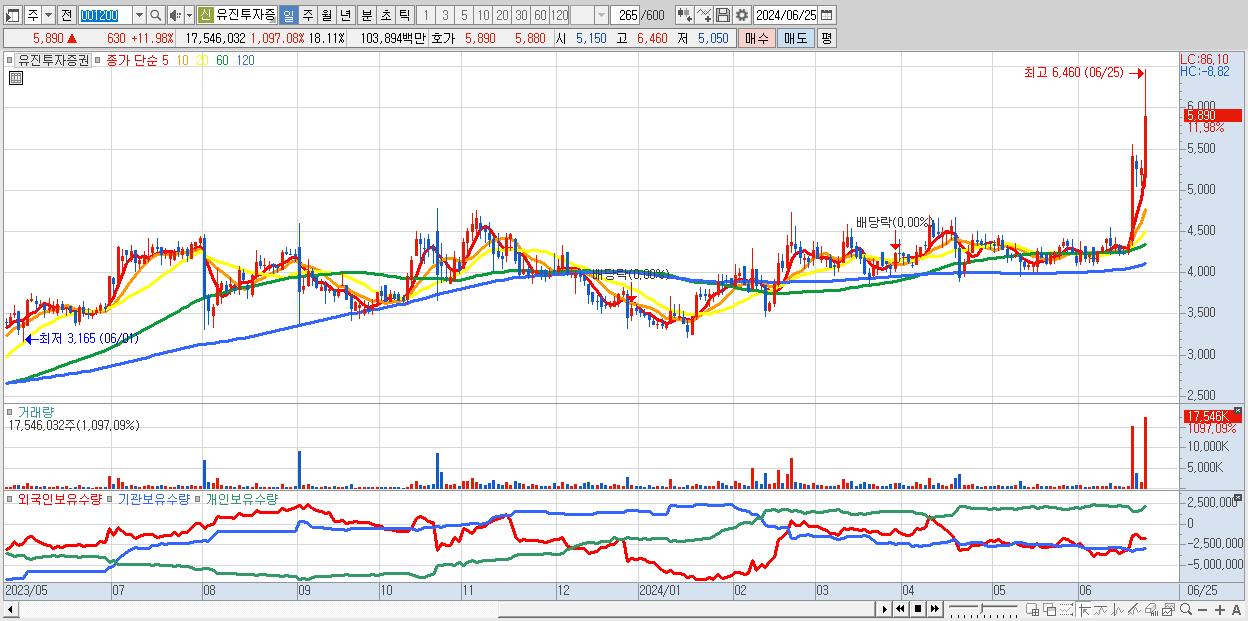 - 유진투자증권 (5,890원 ▲ 11.98% , 시총: 5,705억, 거래량: 17,546,032, 거래대금:1,039억)