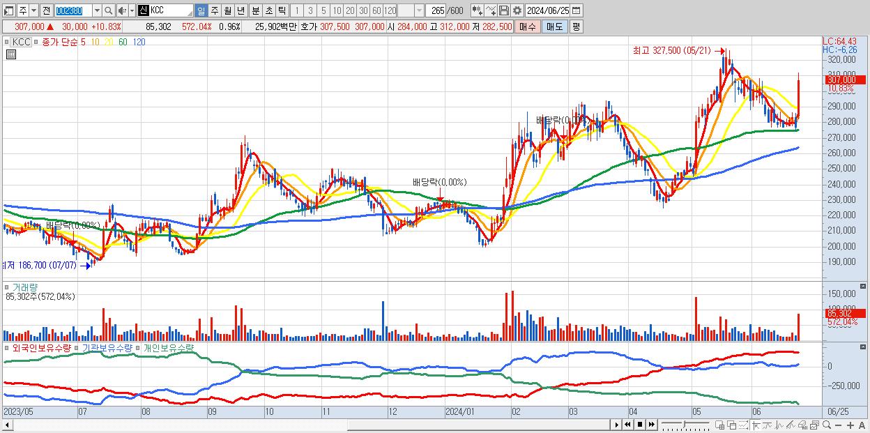 - KCC (307,000원 ▲ 10.83% , 시총: 27,281억, 거래량: 85,302, 거래대금:259억)