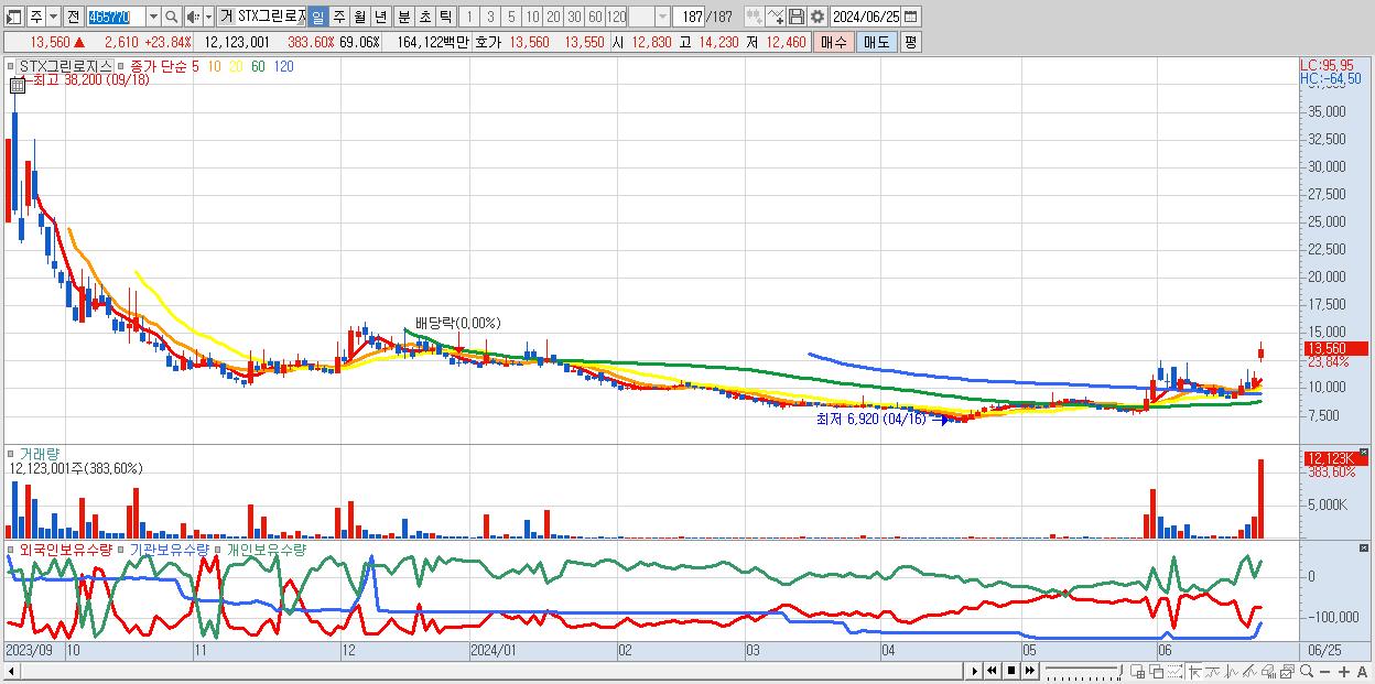 - STX그린로지스 (13,560원 ▲ 23.84% , 시총: 972억, 거래량: 12,123,001, 거래대금:1,641억)