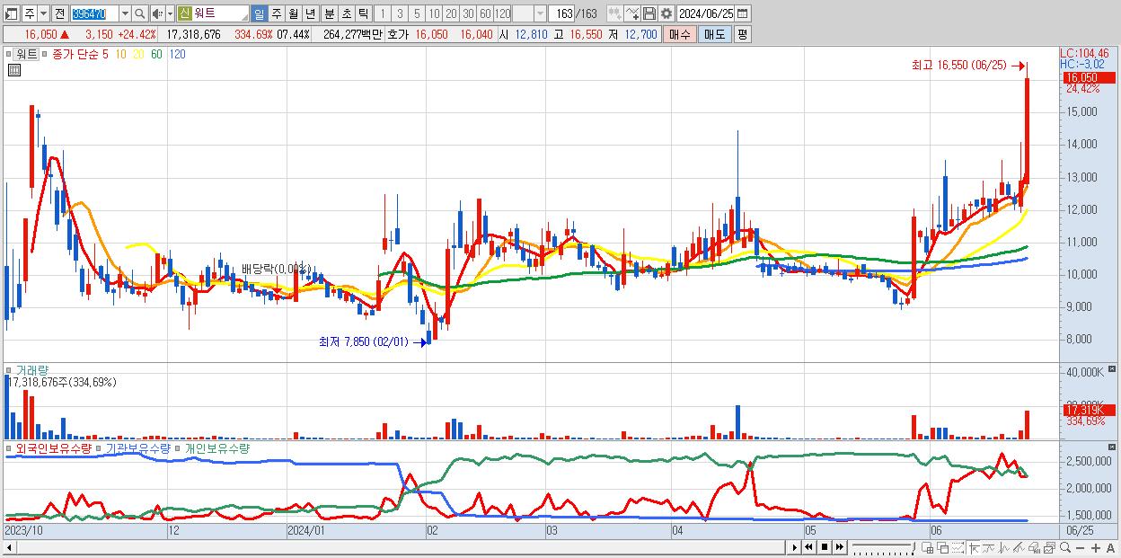 - 워트 (16,050원 ▲ 24.42% , 시총: 2,587억, 거래량: 17,318,676, 거래대금:2,643억, KOSDAQ)