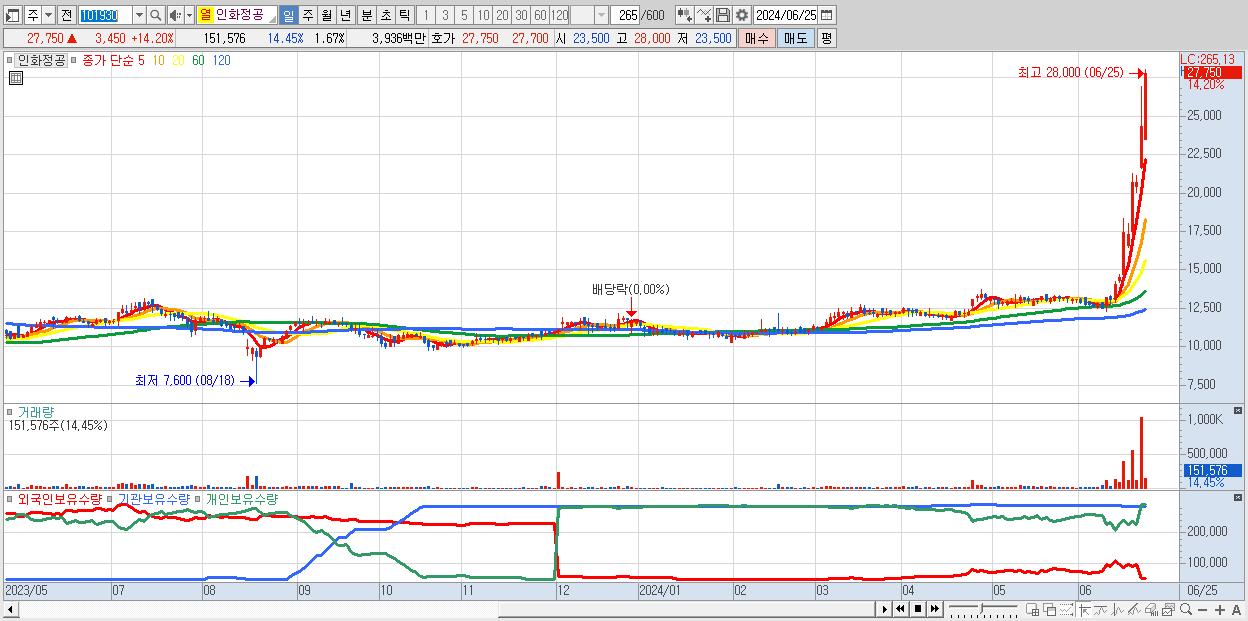 - 인화정공 (27,750원 ▲ 14.2% , 시총: 2,516억, 거래량: 151,576, 거래대금:39억, KOSDAQ)