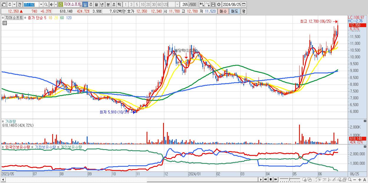 - 지어소프트 (12,350원 ▲ 6.37% , 시총: 1,911억, 거래량: 618,148, 거래대금:76억, KOSDAQ)