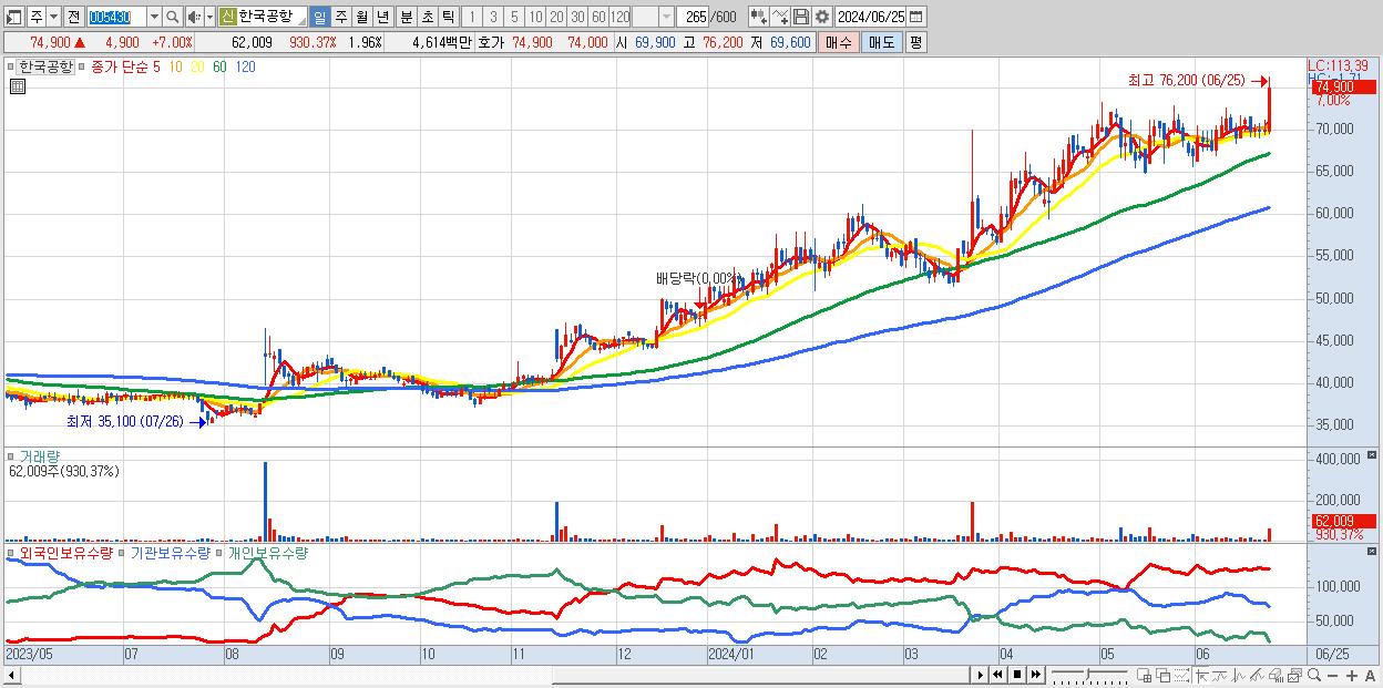 - 한국공항 (74,900원 ▲ 7% , 시총: 2,372억, 거래량: 62,009, 거래대금:46억, KOSPI)