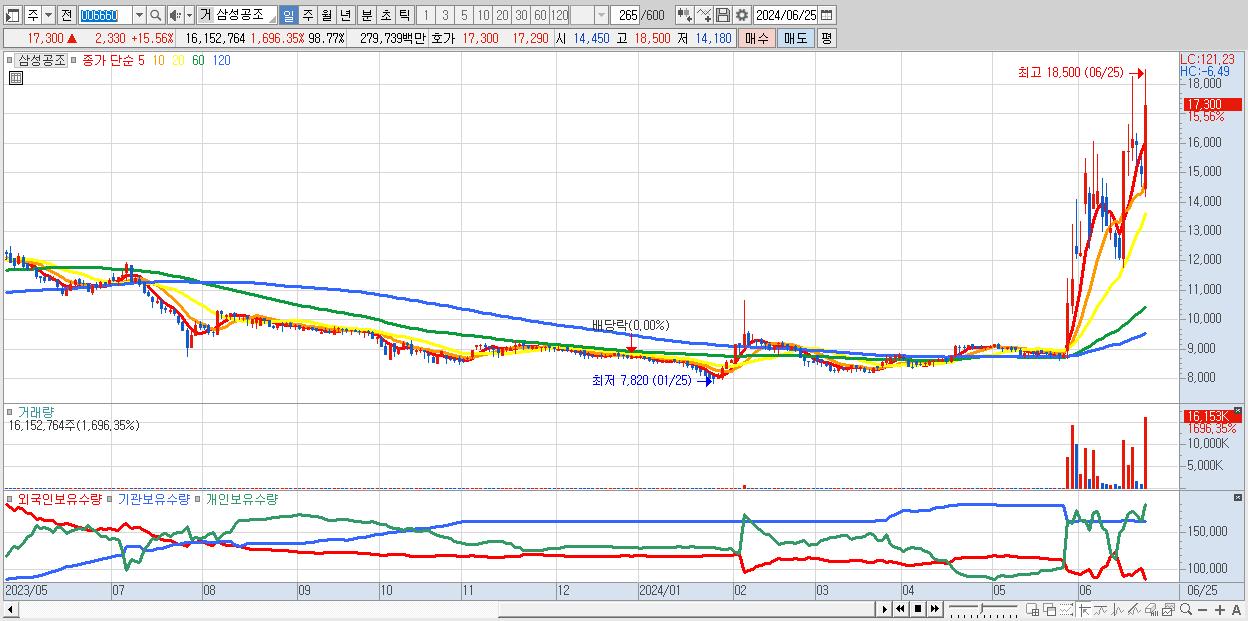 - 삼성공조 (17,300원 ▲ 15.56% , 시총: 1,406억, 거래량: 16,152,764, 거래대금:2,797억)