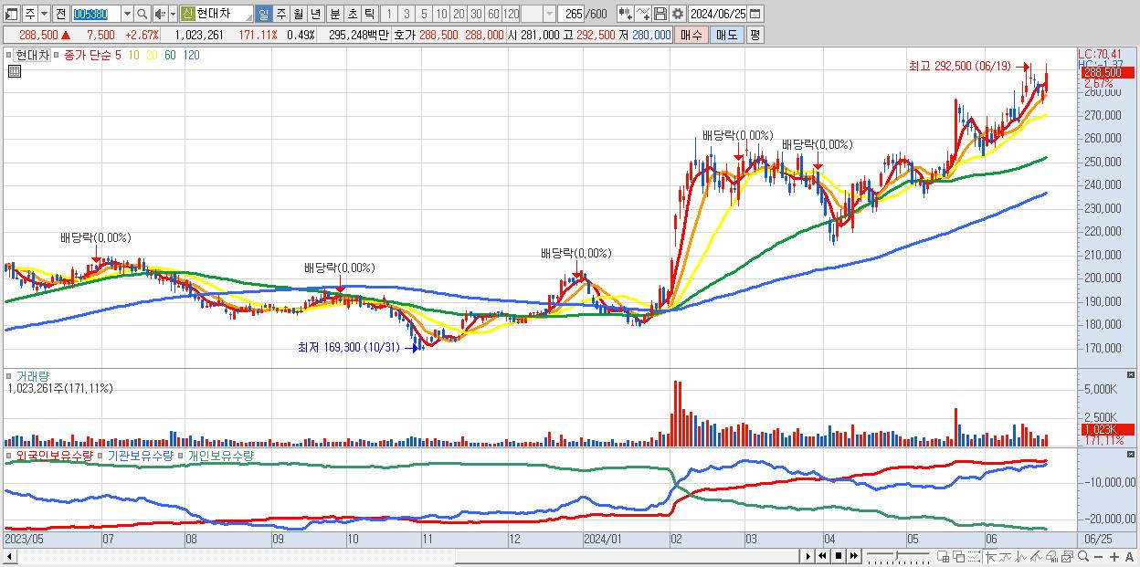 - 현대차 (288,500원 ▲ 2.67% , 시총: 604,166억, 거래량: 1,023,261, 거래대금:2,952억)