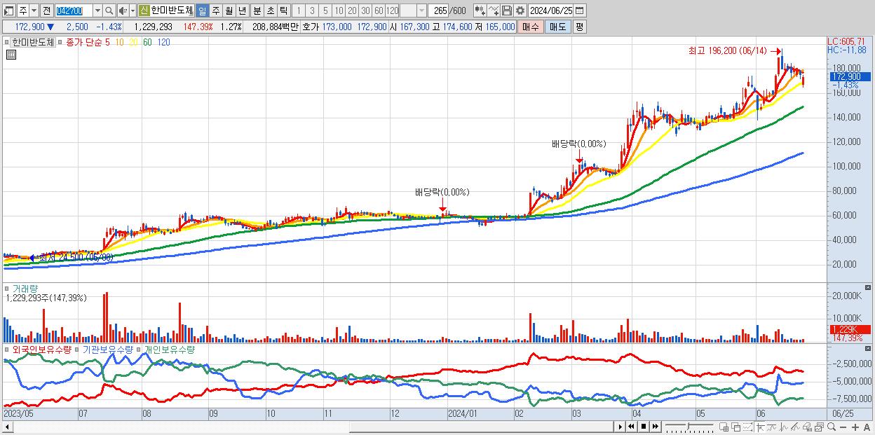 - 한미반도체 (172,900원 ▼ -1.43% , 시총: 167,702억, 거래량: 1,229,293, 거래대금:2,089억)