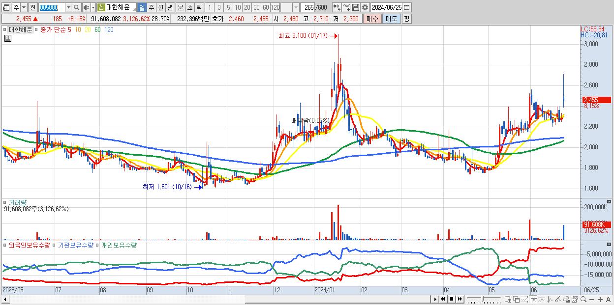 - 대한해운 (2,455원 ▲ 8.15% , 시총: 7,836억, 거래량: 91,608,082, 거래대금:2,324억)