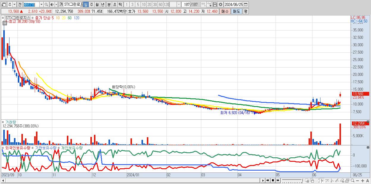 - STX그린로지스 (13,560원 ▲ 23.84% , 시총: 972억, 거래량: 12,294,758, 거래대금:1,665억)