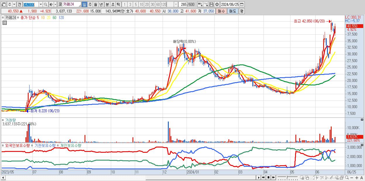 - 카페24 (40,550원 ▲ 4.92% , 시총: 9,835억, 거래량: 3,637,133, 거래대금:1,439억)