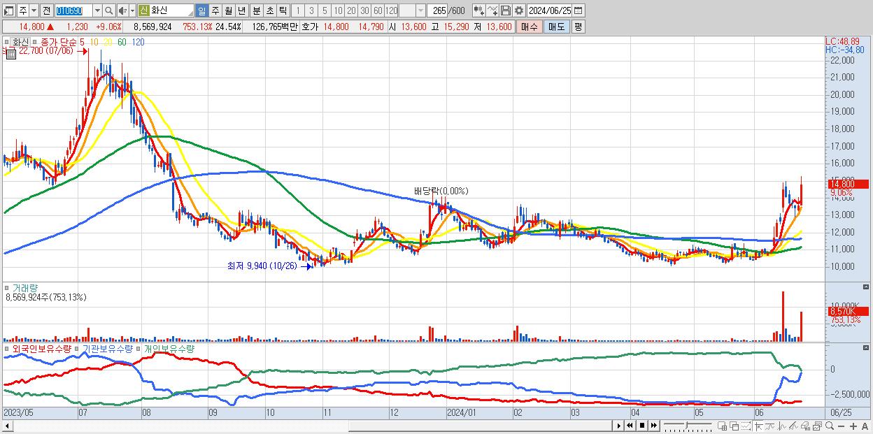 - 화신 (14,800원 ▲ 9.06% , 시총: 5,168억, 거래량: 8,569,924, 거래대금:1,268억)