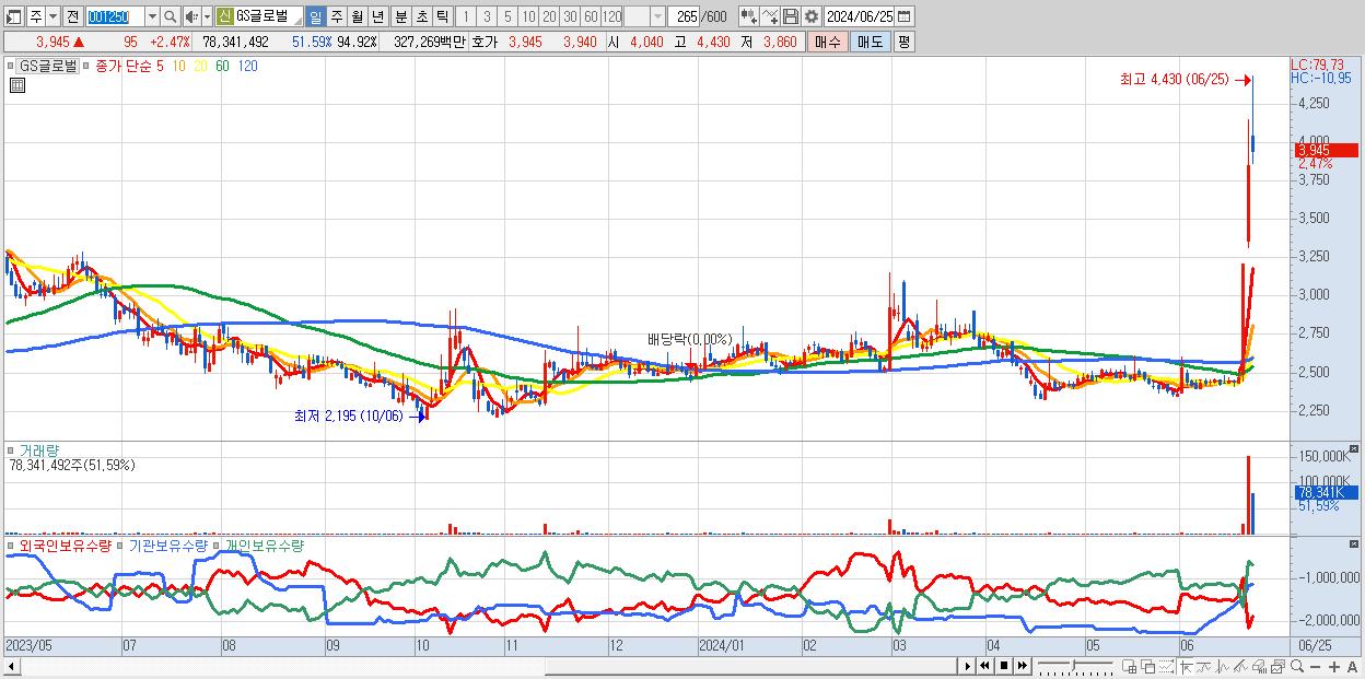 - GS글로벌 (3,945원 ▲ 2.47% , 시총: 3,256억, 거래량: 78,341,492, 거래대금:3,273억)