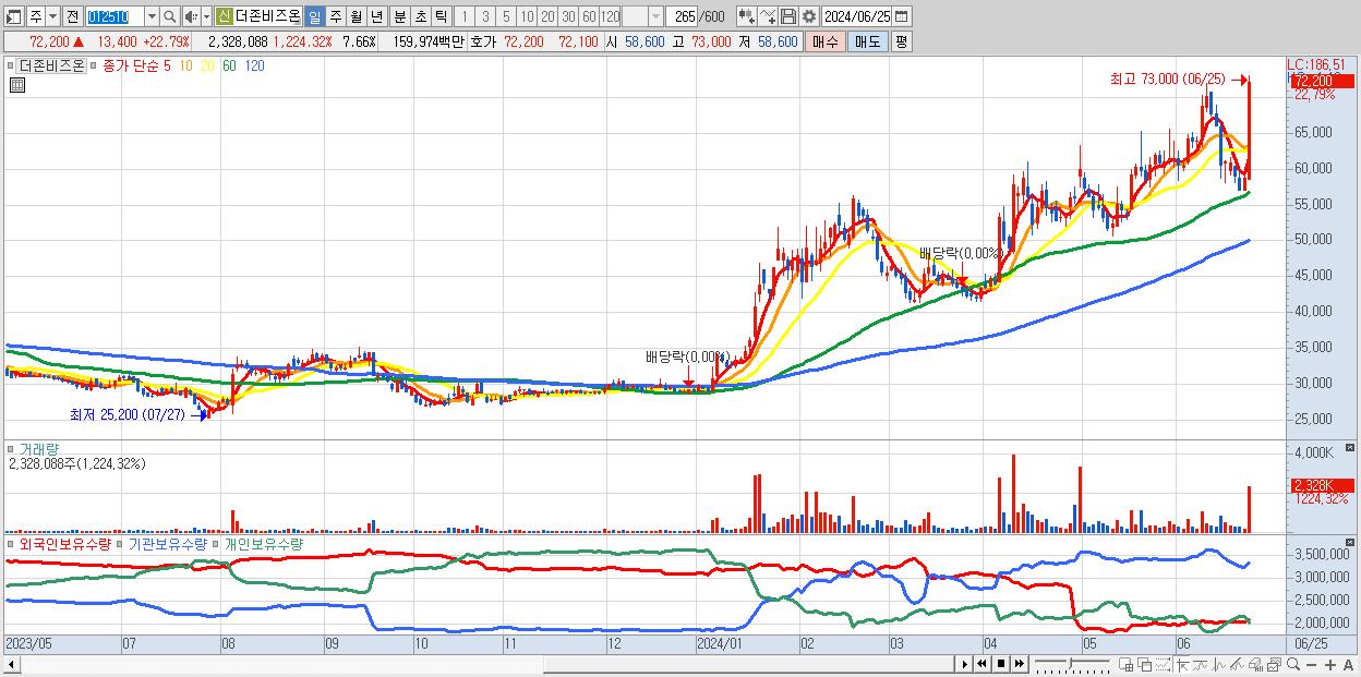- 더존비즈온 (72,200원 ▲ 22.79% , 시총: 21,936억, 거래량: 2,328,088, 거래대금:1,600억)
