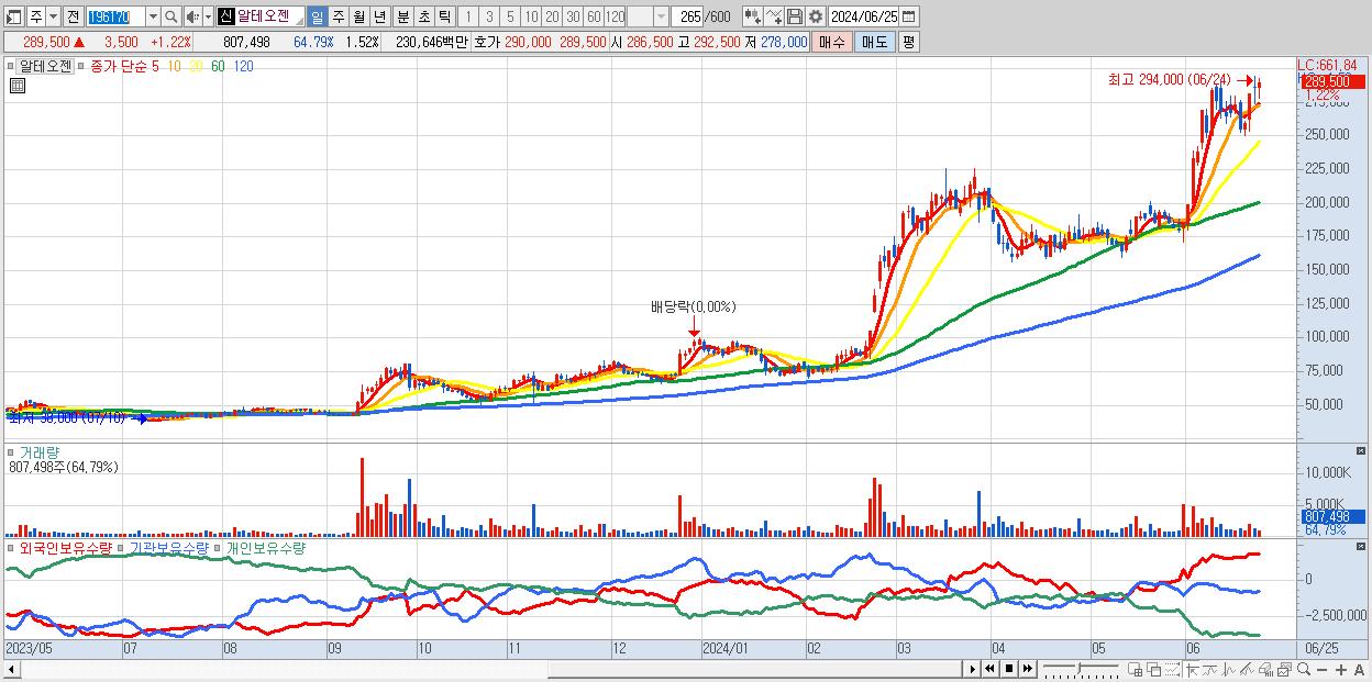 - 알테오젠 (289,500원 ▲ 1.22% , 시총: 153,865억, 거래량: 807,498, 거래대금:2,306억)