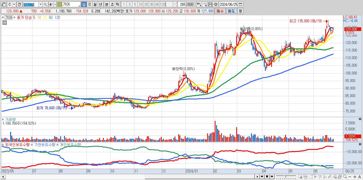 - 기아 (129,000원 ▲ 0.55% , 시총: 515,817억, 거래량: 1,100,760, 거래대금:1,422억)