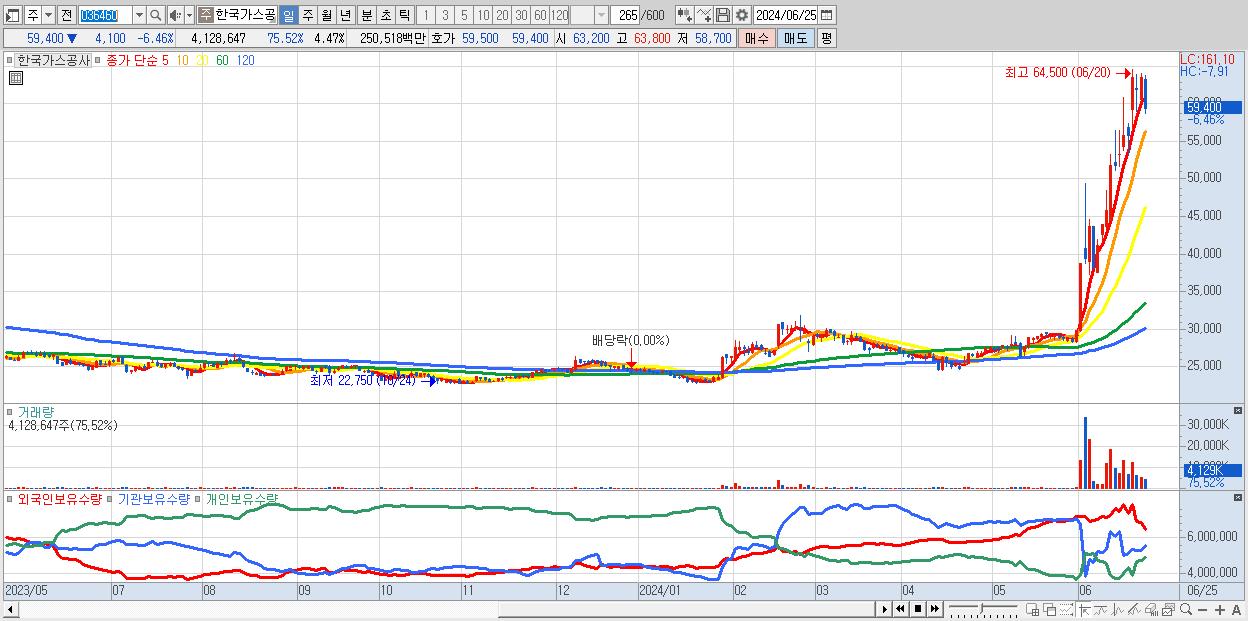 - 한국가스공사 (59,400원 ▼ -6.46% , 시총: 54,834억, 거래량: 4,128,647, 거래대금:2,505억)