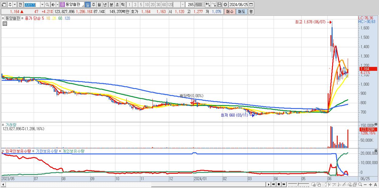 - 동양철관 (1,164원 ▲ 4.21% , 시총: 1,654억, 거래량: 123,827,896, 거래대금:1,494억)