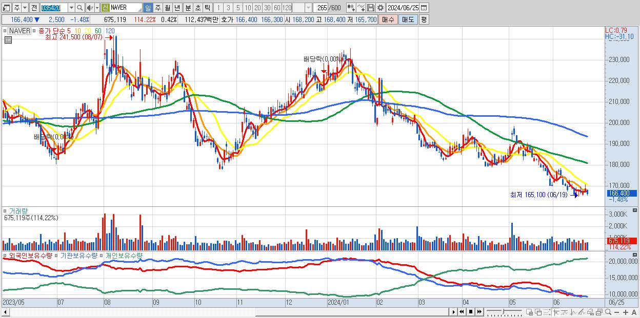- NAVER (166,400원 ▼ -1.48% , 시총: 270,248억, 거래량: 675,119, 거래대금:1,124억)