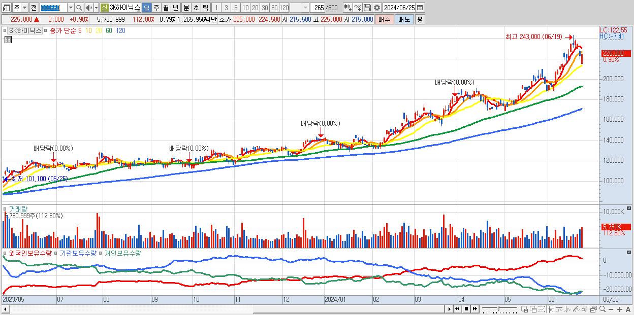 - SK하이닉스 (225,000원 ▲ 0.9% , 시총: 1,638,005억, 거래량: 5,730,999, 거래대금:12,660억)