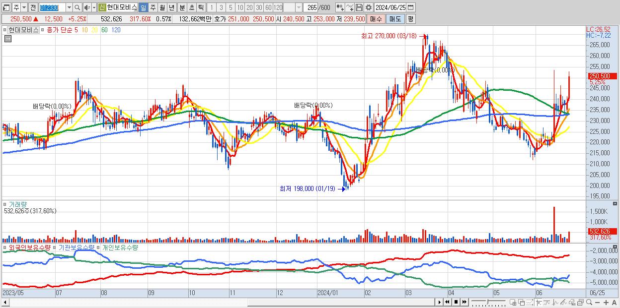 - 현대모비스 (250,500원 ▲ 5.25% , 시총: 232,953억, 거래량: 532,626, 거래대금:1,327억)