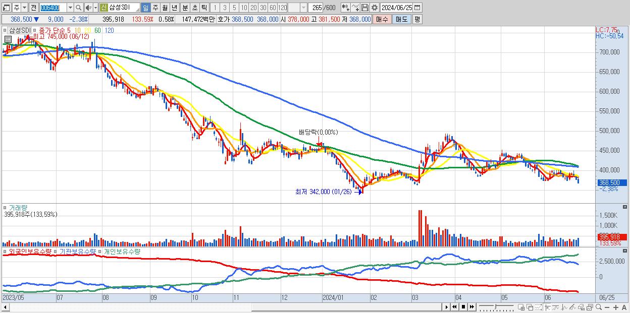 - 삼성SDI (368,500원 ▼ -2.38% , 시총: 253,397억, 거래량: 395,918, 거래대금:1,475억)